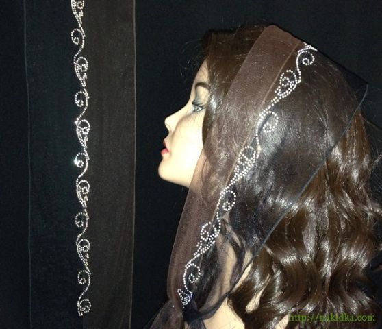 | Черный с коричневым двутонный легкий фатиновый шарф с наклееным блестящим узором и прямым ободком |