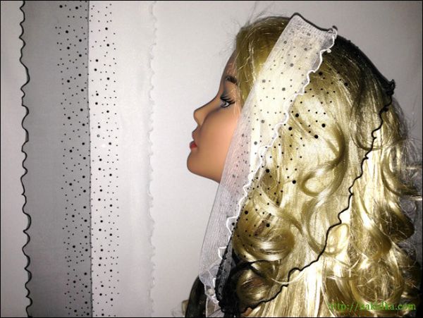 | Черный с белым двутонный фатиновый шарф с наклееным черным узором и волнистым ободком |