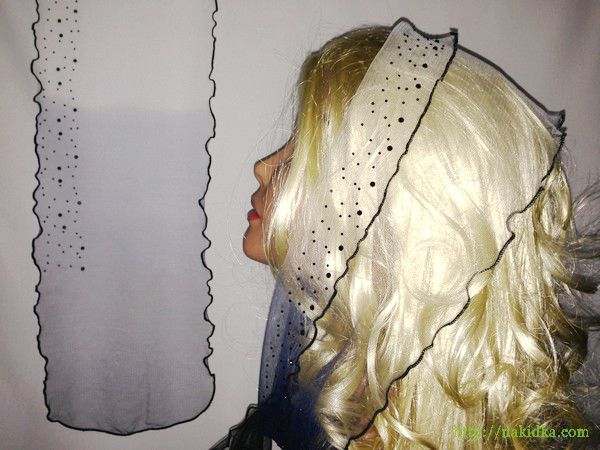 | Белый с черно-темно-синим легкий фатиновый шарф с наклееным черным узором и волнистым ободком |