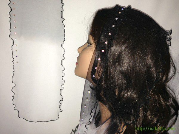 | Белый с черным легкий фатиновый шарф с наклееными перламутровыми камушками и волнистым ободком |
