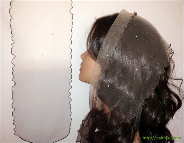 | Кофейный с коричневым легкий фатиновый шарф с наклееными перламутровыми камушками и волнистым ободком |