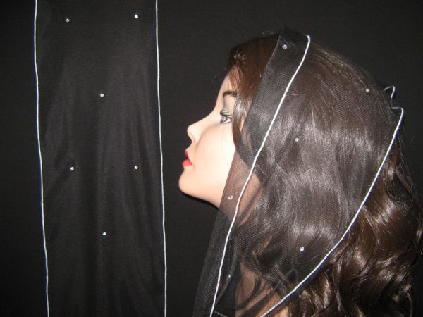 | Черный фатиновый шарф с наклееными блестящими камушками и белым прямым ободком |