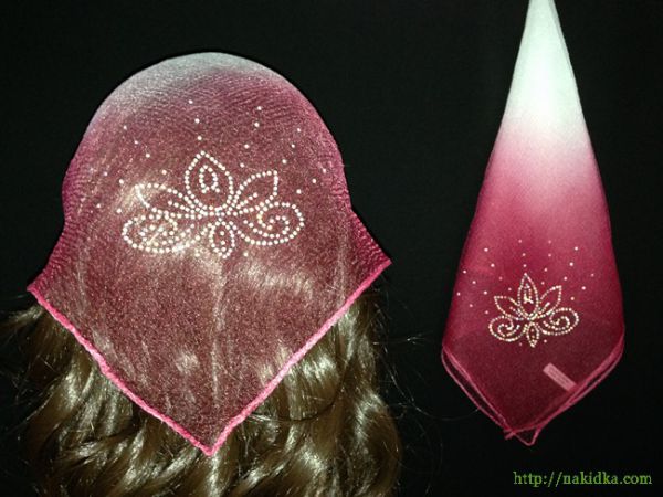 | Белая с бордовыми краями нейлоновая косынка с наклееным блестящим перламутровым узором |