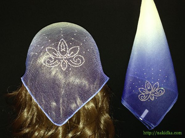 | Белая с синими краями нейлоновая косынка с наклееным блестящим перламутровым узором |