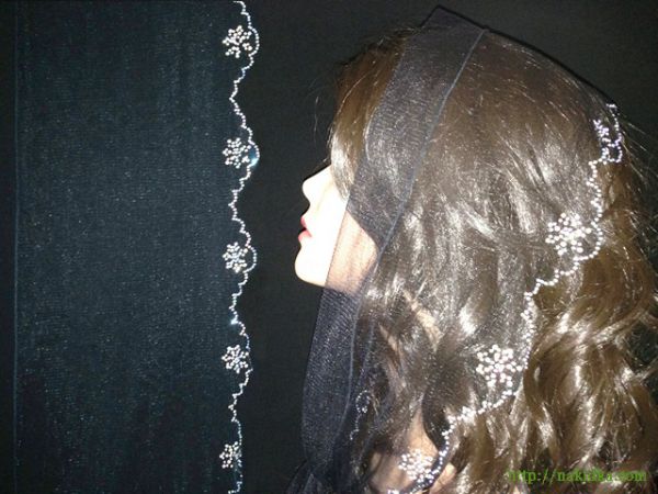| Черный легкий фатиновый шарф с наклееным блестящим узором по ободку |