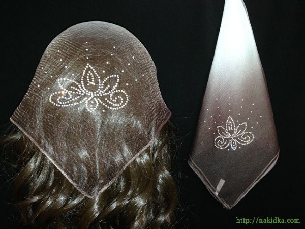 | Белая с коричневыми краями нейлоновая косынка с наклееным блестящим перламутровым узором |