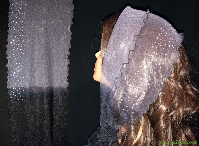 | Серо-фиолетовый с черным легкий фатиновый шарф с наклееным серебристым узором и черным волнистым ободком |
