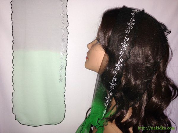 | Зеленый с черным легкий фатиновый шарф с наклееным блестящим узором и волнистым ободком |
