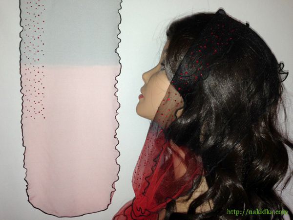 | Красный с черным легкий фатиновый шарф с наклееным красным узором и волнистым ободком |
