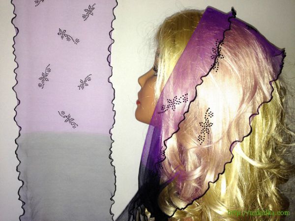 | Фиолетовый с черным легкий фатиновый шарф с наклееным черным узором и черным волнистым ободком |