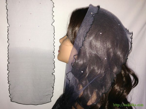 | Серо-фиолетовый с черным легкий фатиновый шарф с наклееными блестящими камушками и черным волнистым ободком |