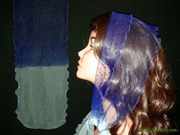 | Синий с голубым легкий фатиновый шарф с наклееными синими камешками и волнистым ободком |