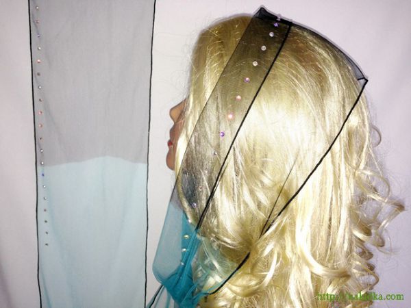 | Черный с бирюзовым легкий фатиновый шарф с наклееными перламутровыми камушками и прямым ободком |