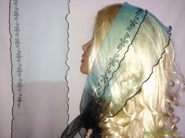 | Бирюзовый с черным легкий фатиновый шарф с наклееным черным узором и волнистым ободком |