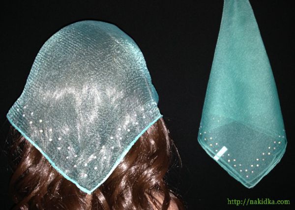 | Зеленая однотонная нейлоновая косынка с наклееными по краю перламутровыми камушками |