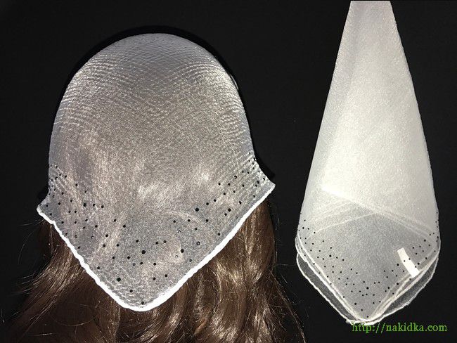 | Белая однотонная нейлоновая косынка с наклеенными по краю черными камушками |