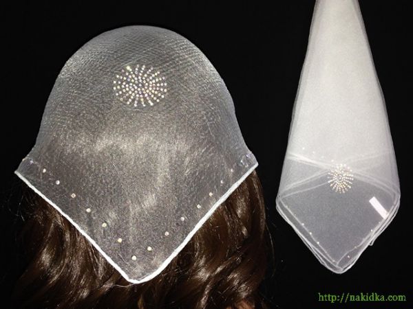 | Белая однотонная нейлоновая косынка с наклееным блестящим узором |