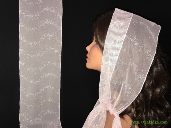 | Светло-розовый фатиновый шарф с наклеенным серебристым узором и прямым ободком |