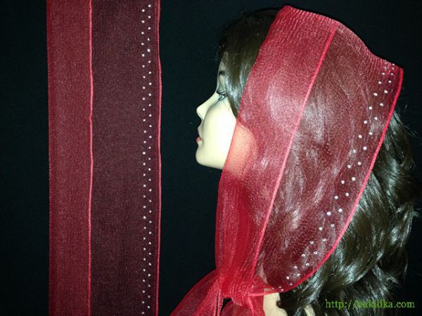 | Красный нейлоновый шарф с наклееными по краю блестящими камушками |