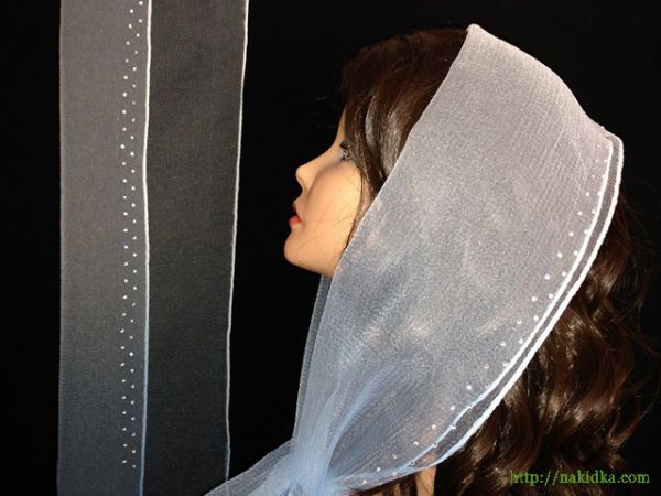 | Белый с голубым утененный шарф с наклееными блестящими камушками |