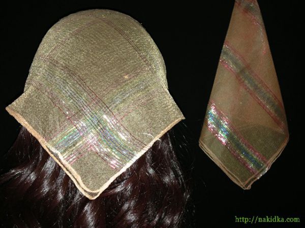| Кофейная однотонная нейлоновая косынка с радужной люрексовой полоской |