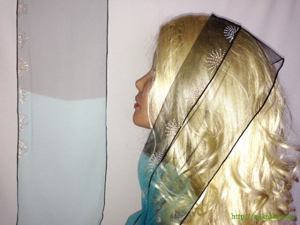 | Черный с бирюзовым легкий фатиновый шарф с наклееным перламутровым узором и прямым ободком |