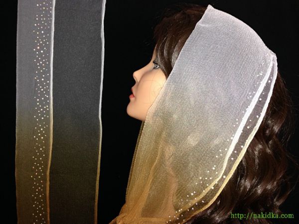| Утененный бело-горчичный нейлоновый шарф с наклееными блестящими камушками |