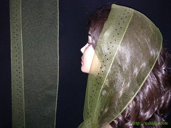 | Оливковый нейлоновый шарф с наклееными по краю черными камушками |