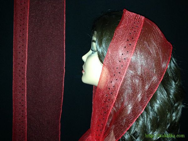 | Красный нейлоновый шарф с наклееными по краю черными камушками |