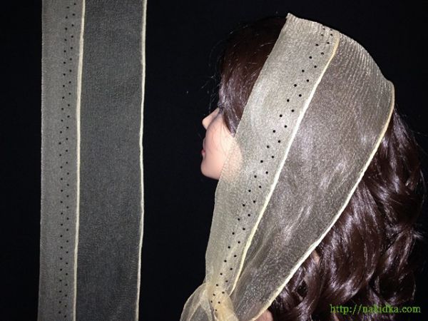 | Бежевый нейлоновый шарф с наклееными по краю черными камушками |