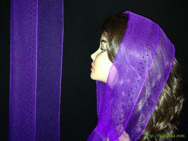 | Фиолетовый нейлоновый шарф с наклееными по краю черными камушками |