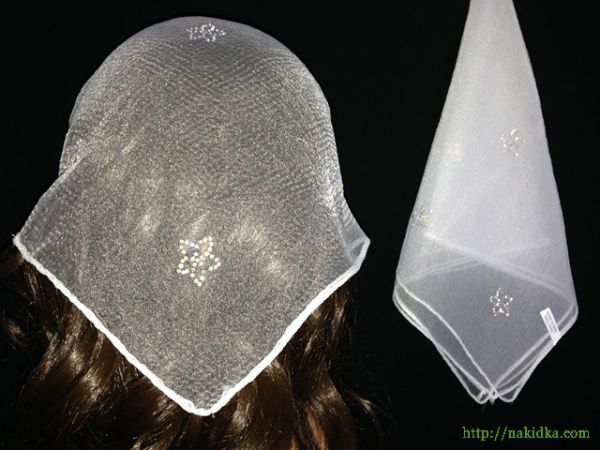 | Белая однотонная нейлоновая косынка с наклееным перламутровым узором |