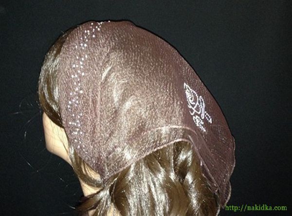 | Коричневая однотонная нейлоновая косынка с наклееными камушками по ободку и блестящим узором сзади |