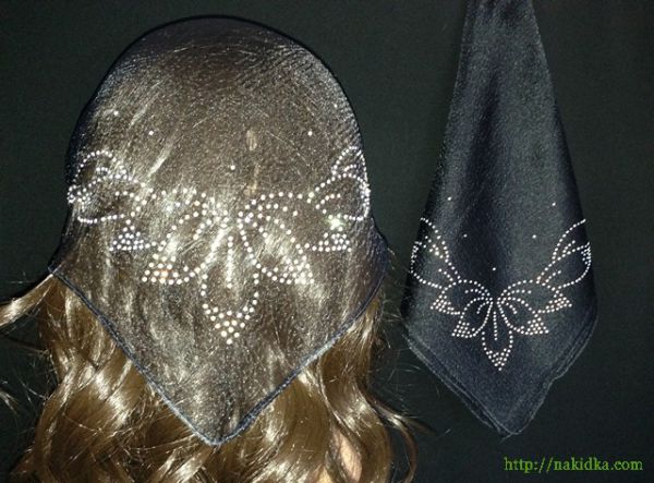 | Черная однотонная нейлоновая косынка с наклееным перламутровым узором |