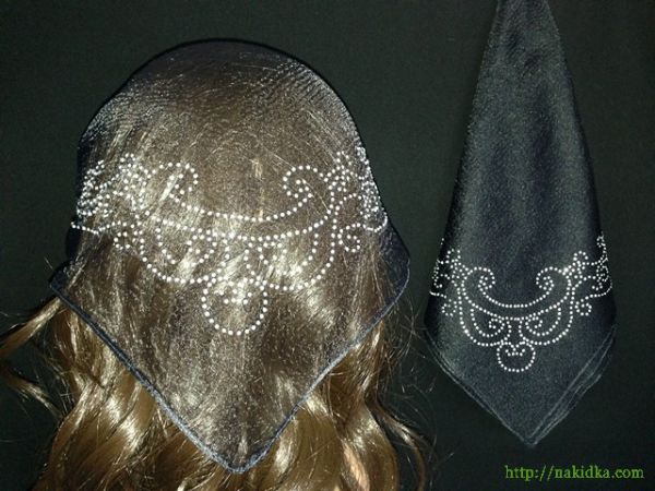 | Черная однотонная нейлоновая косынка с наклееным блестящим узором |