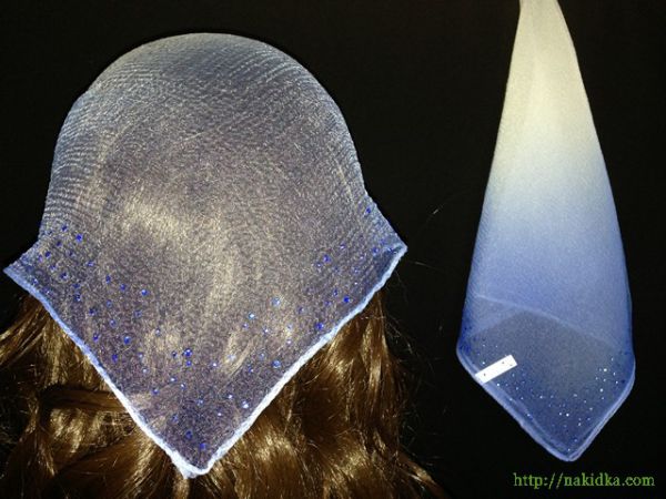 | Белая с голубым нейлоновая косынка с наклееным синим узором |