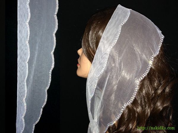 | Белый легкий фатиновый шарф с наклееным перламутровым узором по краям |