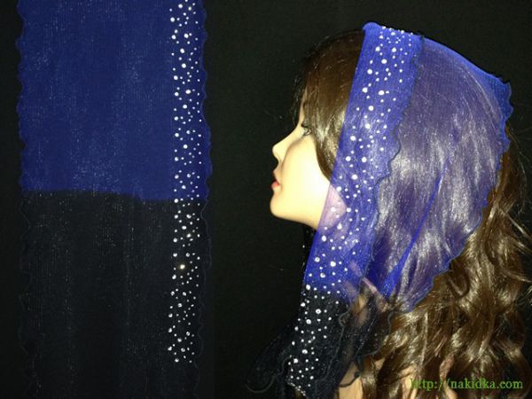 | Синий с черным легкий фатиновый шарф с наклееными блестящими камушками и волнистым ободком |