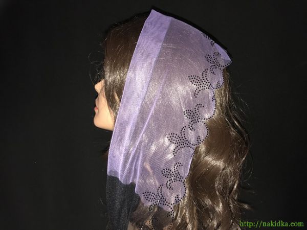 | Светло-фиолетовый с черным легкий фатиновый шарф с наклееным черным узором и черным волнистым ободком |