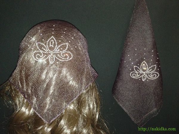| Коричневая однотонная нейлоновая косынка с наклееным перламутровым узором |