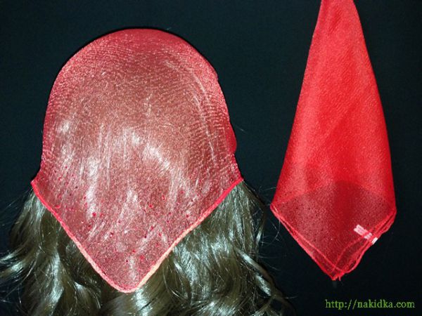 | Красная однотонная нейлоновая косынка с наклееными красными камушками |