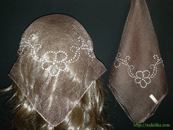 | Коричневая однотонная нейлоновая косынка с наклееным перламутровым узором |