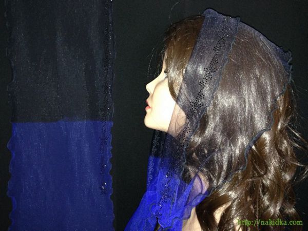 | Черный с синим легкий фатиновый шарф с наклееным черным узором и волнистым ободком |