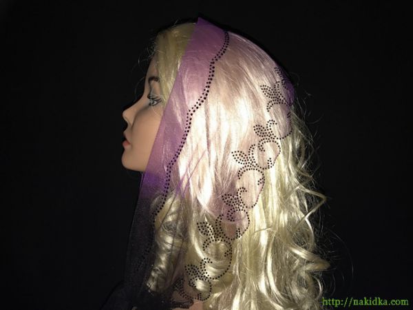 | Фиолетовый с черным легкий фатиновый шарф с наклееным черным узором и черным волнистым ободком |