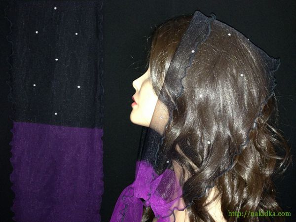 | Черный с фиолетовым легкий фатиновый шарф с наклееными блестящими камушками и черным волнистым ободком |