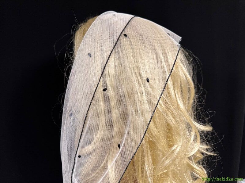 | Белый фатиновый шарф с черным ободком с наклеенными овальными черными камушками вразброс |
