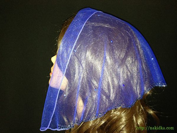 | Синяя легкая фатиновая накидка с наклееными синими камушками и синим узором по краям |
