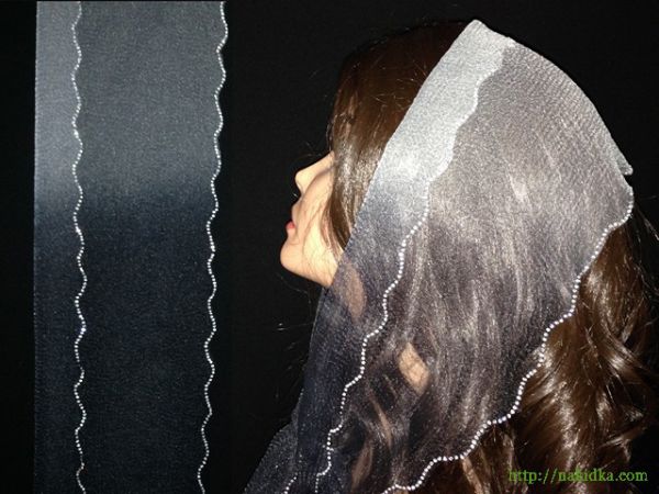 | Утененный бело-черный нейлоновый шарф с наклееным перламутровым узором по краям |