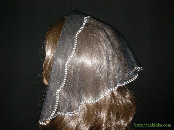 | Черная легкая фатиновая накидка с волнистой кромкой с наклееным по ее контуру перламутровым узором |