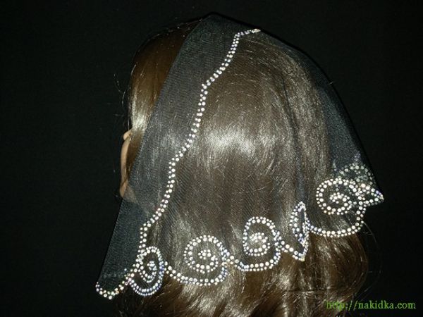 | Черная легкая фатиновая накидка с волнистой кромкой с наклееным по ее нижнему контуру перламутровым узором |